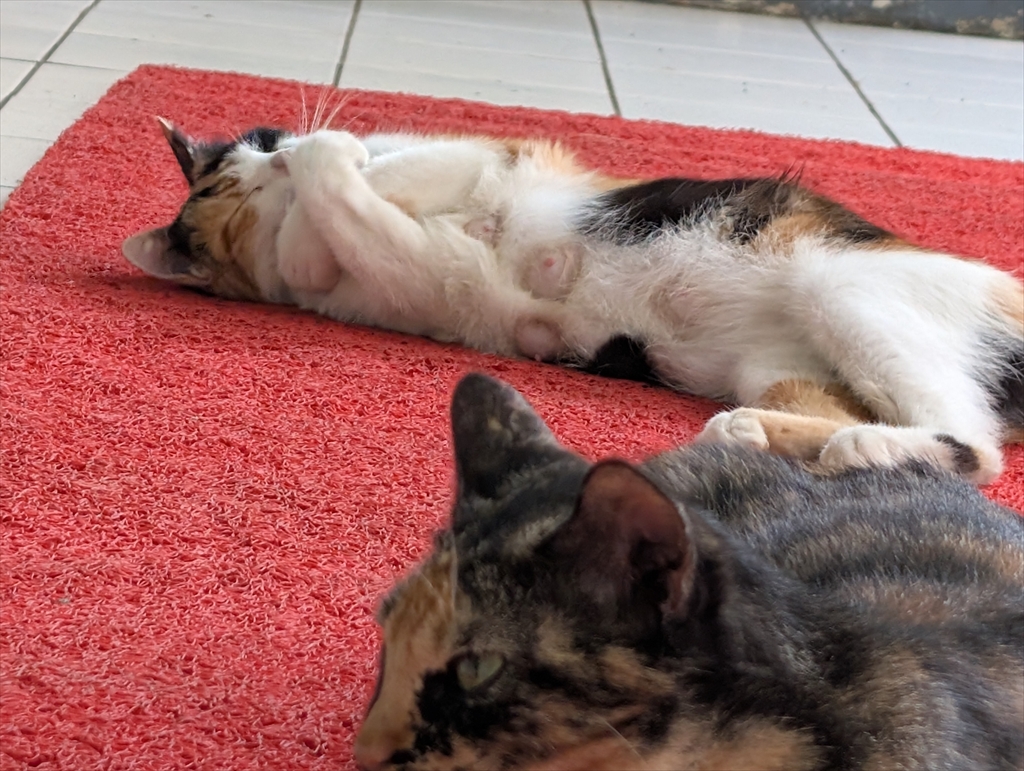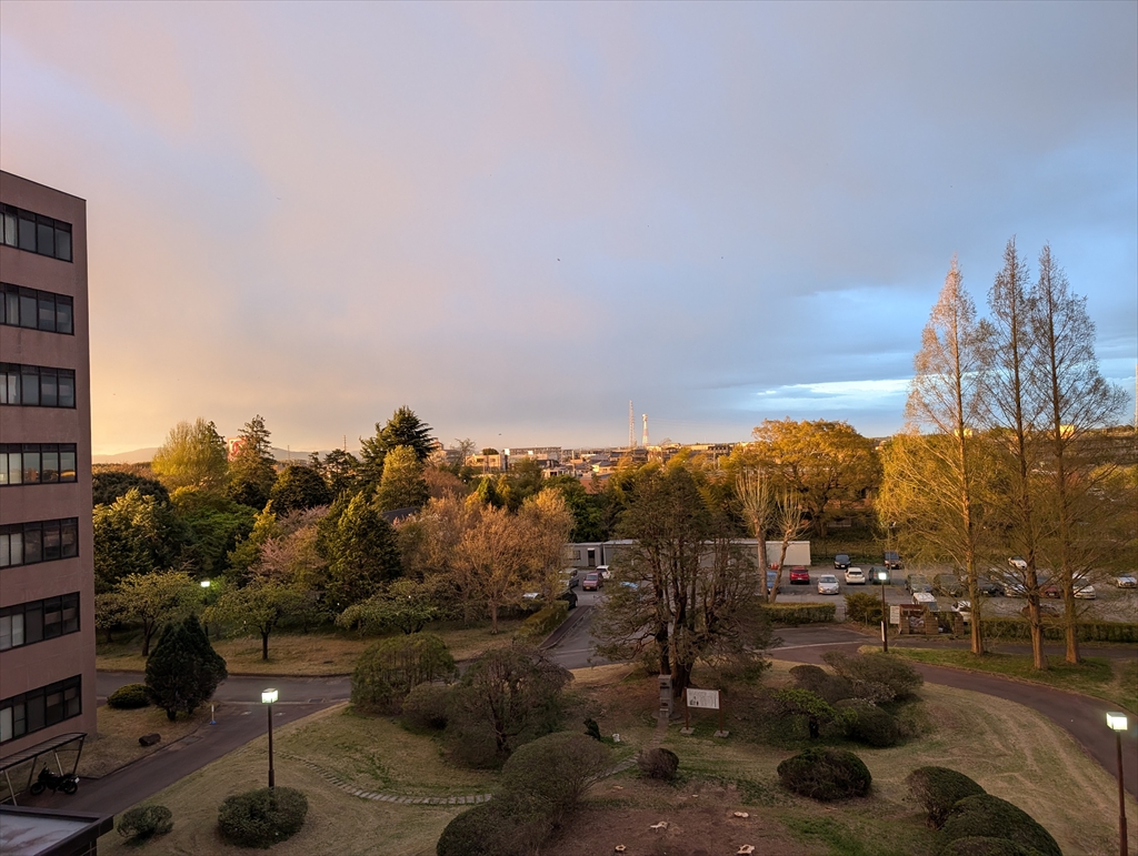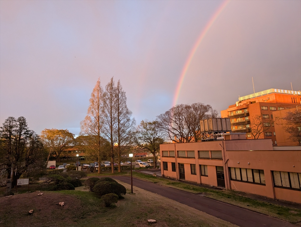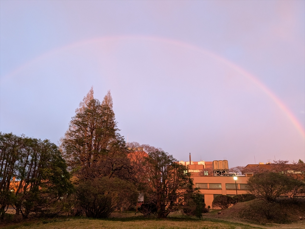 黄砂の影響か?空が紫色になっていると思ったら虹が出ていました。なんとなく,樹がネコちゃんの形になっていることに初めて気が付きました。そんな景色を階段の踊り場からオジサン2人で見ていて,ふと我に返りました。