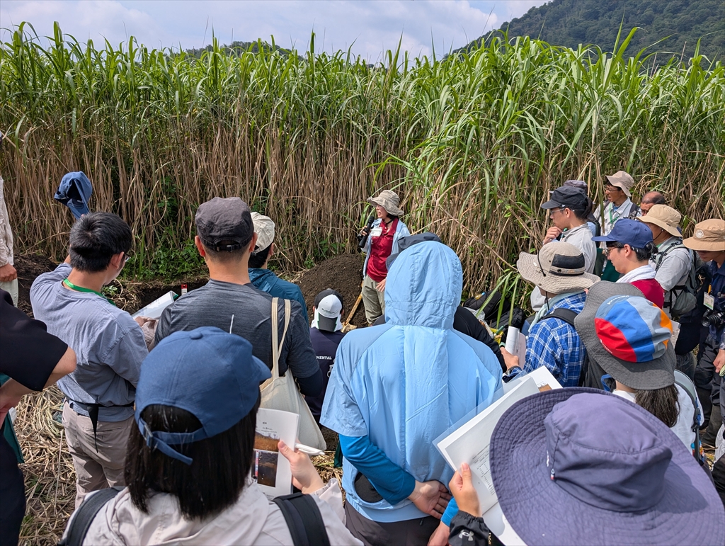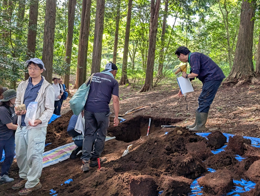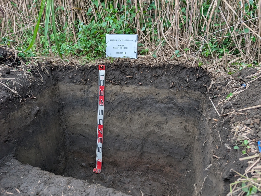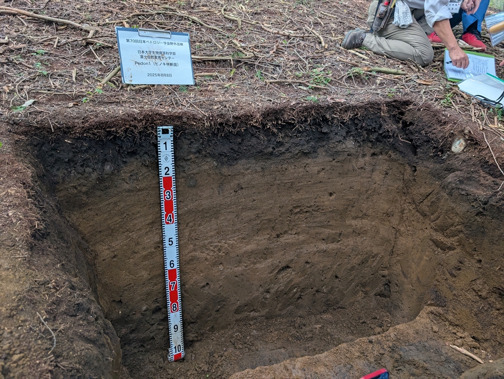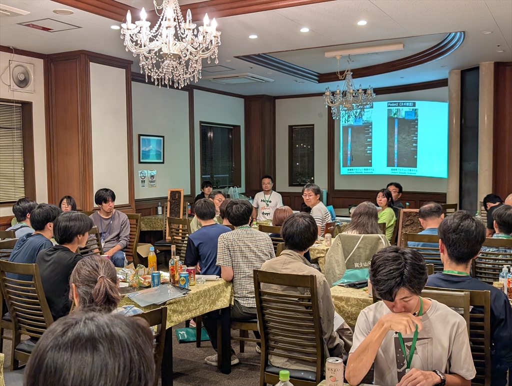 20年振りのペド参戦。M2川崎さんとM1船津丸君のポスター発表にはみなさんから温かいご意見を頂くことができました。午後のシンポジウムは黒ボク土の黒味に関する内容で,これぞペドという楽しさでした。自然の法則と,そこに見え隠れする人為の影響を科学する楽しさは応用学問の根っこと言えると思いますし,何よりロマンがあります。翌日は富士山周辺の黒ボク土をテーマとした巡検に参加。日大の小林先生,中塚先生らによる美しい断面が印象的でした。夜の放談会と,放談会後の放談会で,学問の面白さと奥深さを再確認することができました。