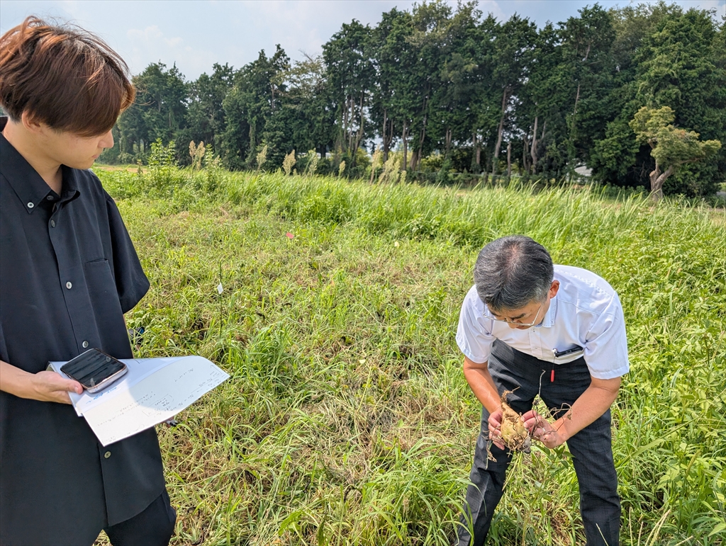 共同研究先の方をお迎えして,iFCテンサイ圃場の予備調査。葉っぱがない… よって,予定を早めて9月上旬には収穫調査を強行することとなりました。